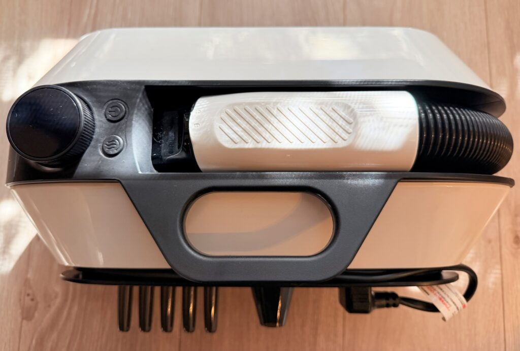 掃除機などこの手の家電はノズルがどうしても別保管になりがちですが、petabooは本体に装着可能です。